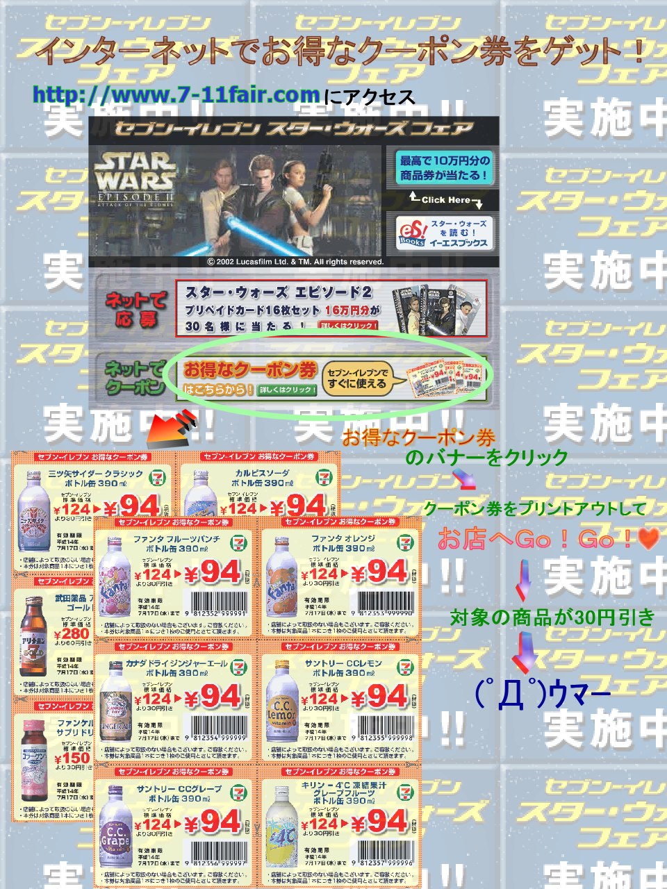 この話、ホントははじまった直後に書くつもりだったんだけど、日記サボってたのですっかりタイミングを外してしまいましたが(の割には7月11日→7−11の日なのであながち外してもいないか?)、7−11フェアって今やってるじゃないですか。当たり券がでたら店員が走り回らせられるという走れぐず共イヤな企画。あぁ?7月度のフレンドリー目標「レジでお客様をお待たせしない」だって?こんなフェアやってて出来るかヴォケってヤツね。